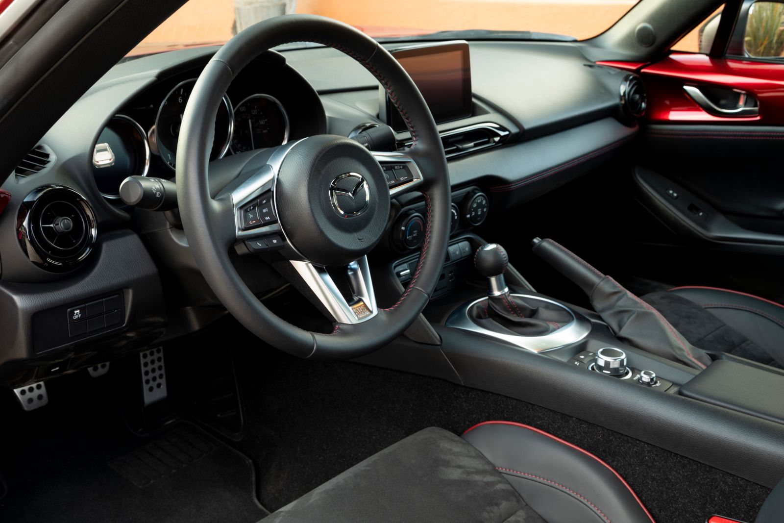 The MX-5 Soft Top includes Mazda Connect infotainment with a seven-inch touchscreen on the GS trim and an 8.8-inch touchscreen on the GT. The RF model offers wireless Apple CarPlay and Android Auto as standard features, along with Bluetooth hands-free calling and audio streaming.